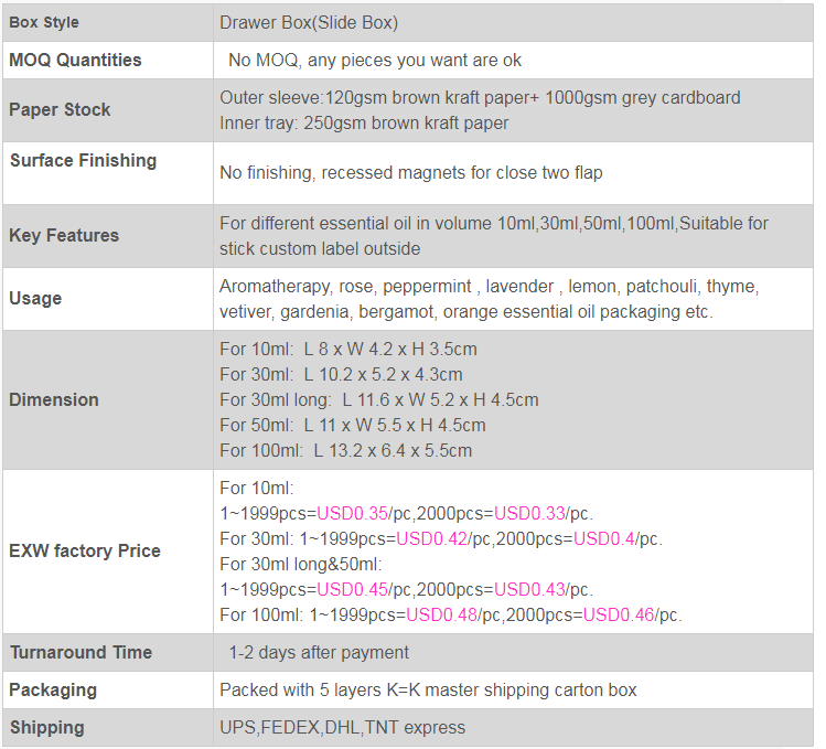 30mlkothak minyak minyak sing pentingUkuran L10.2 x 5.2 x 4.3cm, materi digawe saka 120gsm ecofboard crafpaper 1000gsm kanggo basis coklat, 2 sembrani sing cekak kanggo nutup,